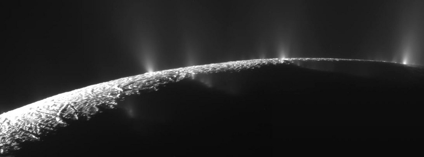 Enceladus, Südpolargebiet "Numerous plumes are seen rising from long tiger-stripe canyons across Enceladus' craggy surface. Several ice jets are even visible in the shadowed region of crescent Enceladus as they reach high enough to scatter sunlight. Other plumes, near the top of the above image, appear visible just over the moon's sunlit edge." (Ausschnitt aus dem Bild, aufgenommen von Cassini am 21. November 2009)