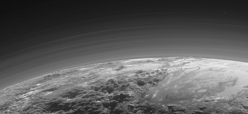 Pluto, Norgay Montes "New Horizons spacecraft looked back (...) and captured this near-sunset view of the rugged, icy mountains and flat ice plains extending to Pluto's horizon. The smooth expanse of the (...) icy plain Sputnik Planum is flanked to the west by rugged mountains up to 3500 meters high, including the (...) Norgay Montes in the foreground and Hillary Montes on the skyline. (...) The backlighting highlights more than a dozen layers of haze in Pluto's tenuous but distended atmosphere. " (Ausschnitt aus dem Bild, aufgenommen von New Horizons am 14. Juli 2015)
