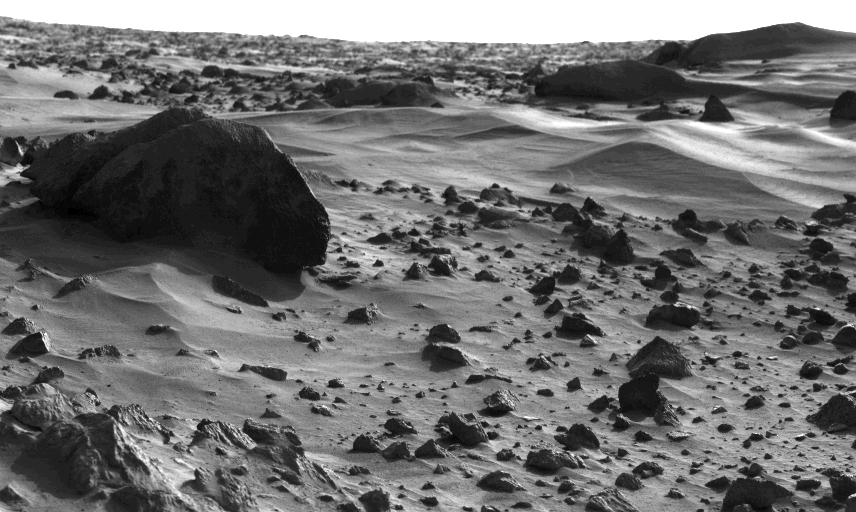 Mars, Chryse Planitia "This spectacular picture of the Martian landscape by the Viking 1 Lander shows a dune field with features remarkably similar to many seen in the deserts of Earth. The dramatic early morning lighting - 7:30 a.m. local Mars time - reveals subtle details and shading. Taken yesterday (August 3) by the Lander's camera #1, the picture covers 100 degrees, looking northeast at left and southeast at right. (...) The sharp dune crests indicate the most recent wind storms capable of moving sand over the dunes in the general direction from upper left to lower right. Small deposits downwind of rocks also indicate this wind direction. Large boulder at left is about eight meters (25 feet) from the spacecraft and measures about one by three meters (...) The sun rose two hours earlier and is about 30 degrees above the horizon near the center of the picture." (Ausschnitt aus dem Panorama, aufgenommen von Viking 1 am 03. August 1976) Quelle: http://photojournal.jpl.nasa.gov/catalog/PIA00393 (16. Juni 2005) (by courtesy NASA / JPL-Caltech)